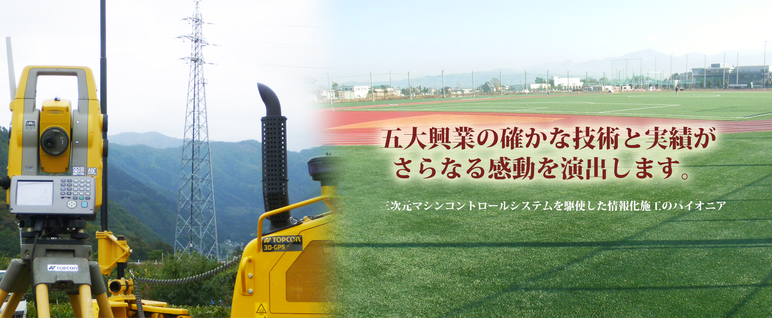 五大興業株式会社(長野県安曇野市)では、学校グランドでの授業・行事・部活動などや、野球、サッカー、陸上、テニスなどで繰り広げられるスポーツシーンを「より正確に」「より安全に」提供できるように、最新の施工技術として、自動追尾機能付トータルステーションを利用した3次元トータルステーションマシンコントロールシステムを導入しております。この3次元トータルステーションマシンコントロールシステムにより、より早く、より精度が高い施工を実現します。当社では、最新の技術とノウハウで精度の高い様々なスポーツ施設の施工をサポートいたします。