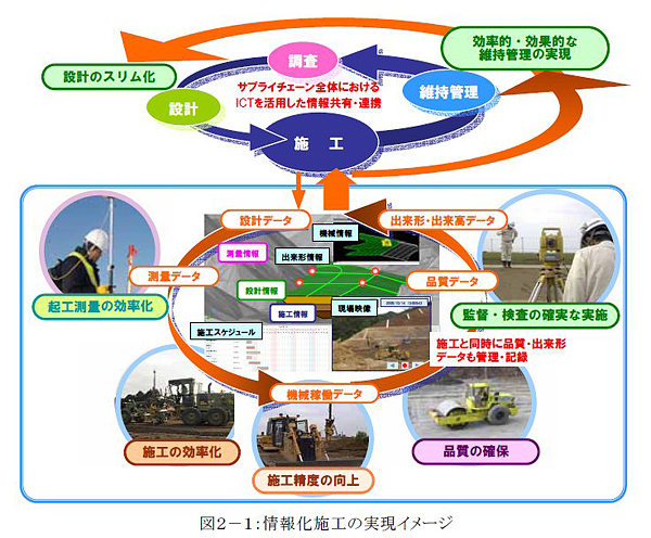 国土交通省では、直轄の道路土木工、舗装工、河川土木の各工事において、大規模の工事では2010年度までに、中小規模の工事では2012年度までに、情報化施工を標準的な施工・施工管理方法として位置づけています。